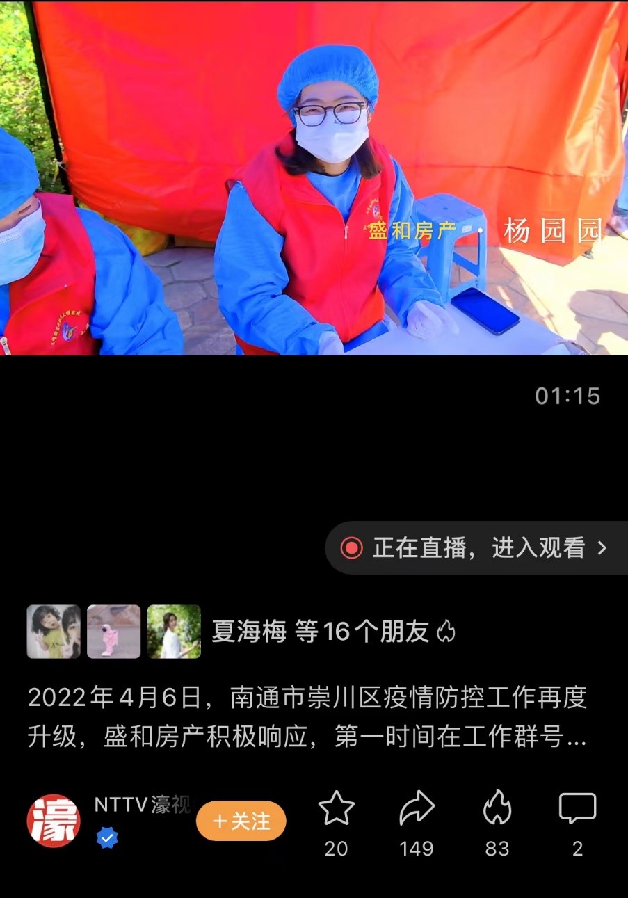 “我們公司72個(gè)人,都在社區(qū)幫忙做志愿者,也沒(méi)有什么特別想說(shuō)的,就是希望南通疫情快點(diǎn)過(guò)去,大家能夠重返以前美好的生活。”這是公司綜合管理部員工楊園園在紅星社區(qū)核酸檢測(cè)點(diǎn)做志愿服務(wù)時(shí)接受NTTV采訪所說(shuō)的話。——沒(méi)有報(bào)酬,沒(méi)有獎(jiǎng)勵(lì),沒(méi)有“研究”和“商量”,他們自覺(jué)自愿。他們是黨員,是群眾;是領(lǐng)導(dǎo),是員工;是兒女,是父母;他們是盛和房產(chǎn)志愿者。