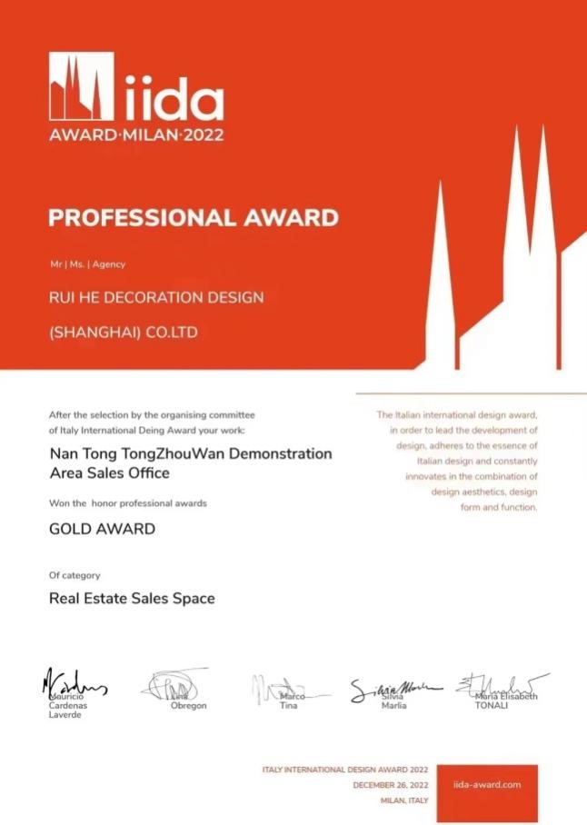 近日,盛和房產(chǎn)開發(fā)的盛和?灣上文華項目(通州灣TR20011地塊)示范區(qū)售樓處設計方案從全球包括意大利、法國、西班牙、日本、韓國、中國及港澳臺等幾十個國家地區(qū)的設計師和設計機構近千套設計作品中脫穎而出,斬獲2022意大利IIDA AWARD國際設計大獎地產(chǎn)售樓類金獎。