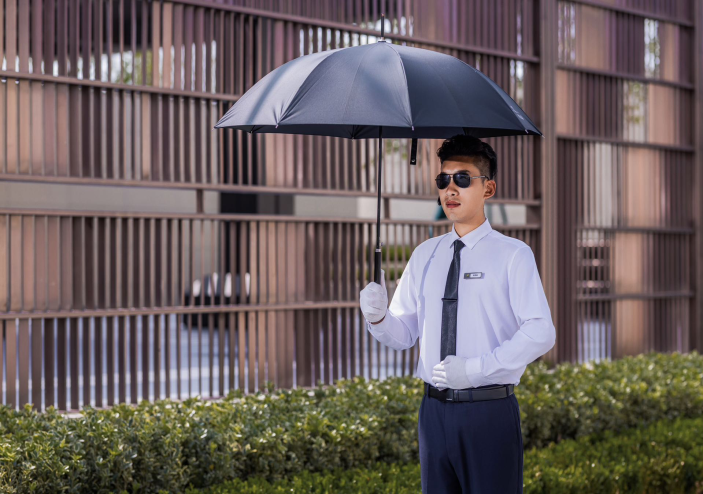 禮賓人員站姿、跨立、敬禮,每一個(gè)動(dòng)作都鏗鏘有力,禮貌問詢、停車指引、遮陽服務(wù)、雨停服務(wù)等,細(xì)致周到的禮賓服務(wù)讓到來的每一位客戶都感受到賓至如歸的親切感。